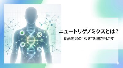 「ニュートリゲノミクス」とはそれぞれ「栄養」と「ゲノム科学」を意味する英単語を組み合わせた造語で、食品成分の摂取に伴って、体内で起こるmRNAやタンパク質、代謝産物の変動を、様々な技術を用いて網羅的に解析する研究です。